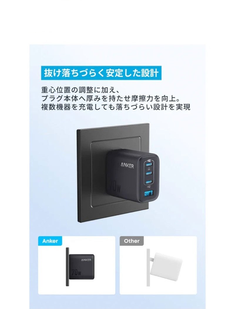 حداکثر توان خروجی ۷۰ وات این شارژر دیواری انکر، امکان شارژ سریع گوشی موبایل، تبلت، لپتاپهای سبک، هدفون بیسیم و سایر دستگاههای دیجیتال را فراهم میکند. در صورت استفاده همزمان از چند پورت، توان بهصورت هوشمند بین دستگاهها توزیع میشود؛ بهگونهای که در استفاده از دو پورت حدود 67.5 وات و در استفاده از سه یا چهار پورت حدود 64.5 وات توان مشترک ارائه میشود.